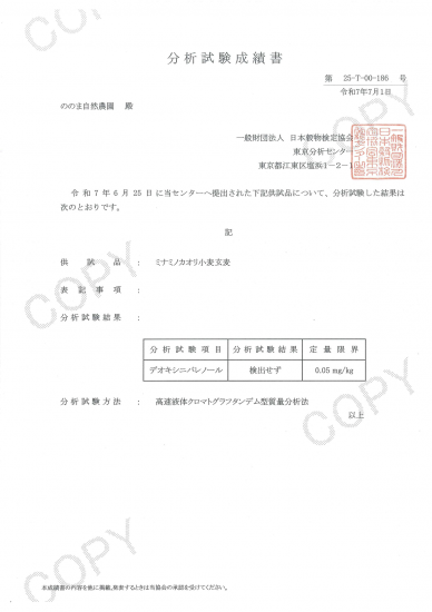 ののま自然農園では、みなさまに安心して小麦を食べていただきたく、収穫した小麦を、カビ毒DONの含有量検査に出しています。
